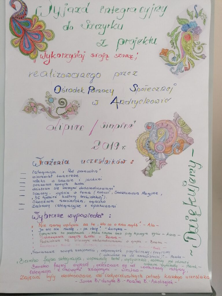 Wsparcie osób z rodzin wieloproblemowych, zagrożonych ubóstwem lub wykluczeniem społecznym – 20 osób (10 kobiet, 10 mężczyzn). Cel – wzmocnienie potencjału społeczno-zatrudnieniowego poprzez działania rozwijające osobowość, integrujące osoby doświadczające wykluczenia.